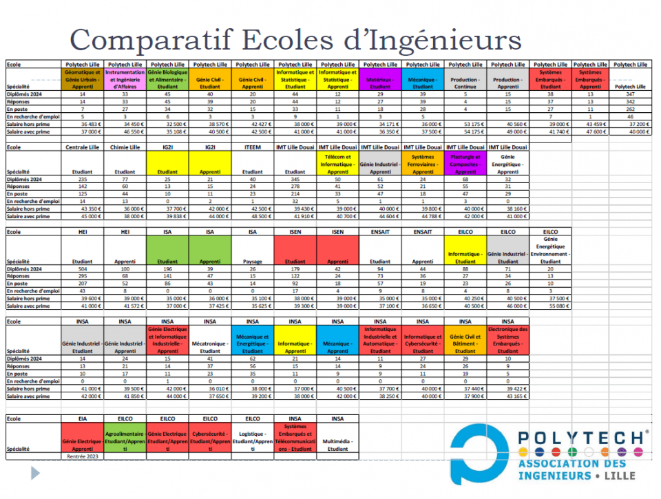 Vous étiez près d'un millier de personnes à visiter le stand de l'Association des Ingénieurs Polytech Lille lors de la Journée Portes Ouvertes de l'école.2 tableaux vous ont fortement intéressés. Les voici en images et en PDFLe premier est consacré au comparatif des écoles d'ingénieurs de l'académie de Lille sur la thématique de l'insertion professionnelle (données issues des données certifiées CTI)Et voici le 2ème consacré aux plus gros recruteurs à Polytech Lille (données issues de l'Association des Ingénieurs Polytech Lille) :